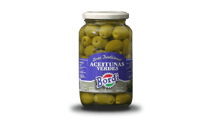 - Ingredientes: Aceitunas verdes, sal y agua.