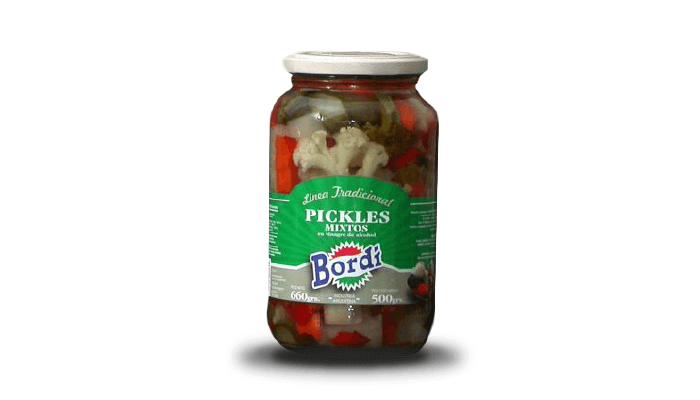 Ingredientes: Pepino, zanahoria, coliflor, hinojo, nabo, morrón, apio, vinagre de alcohol y sal.